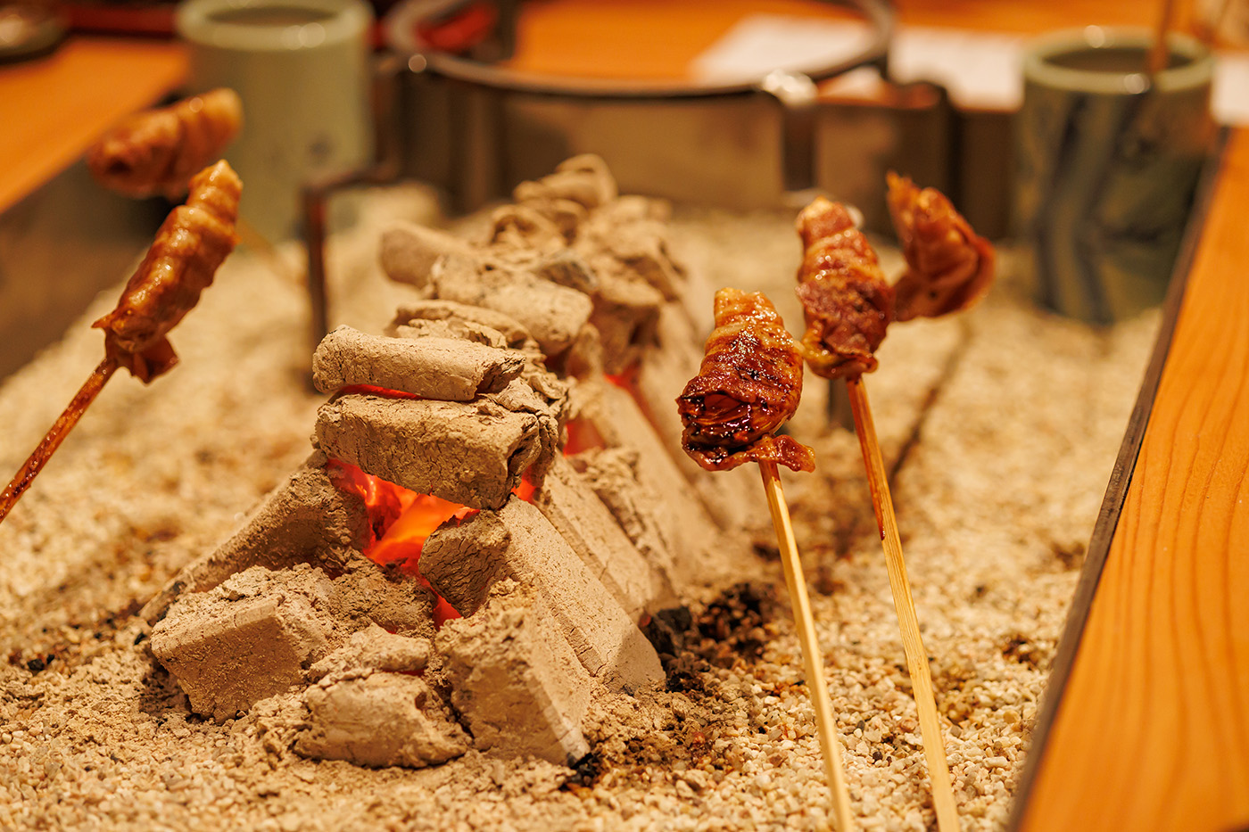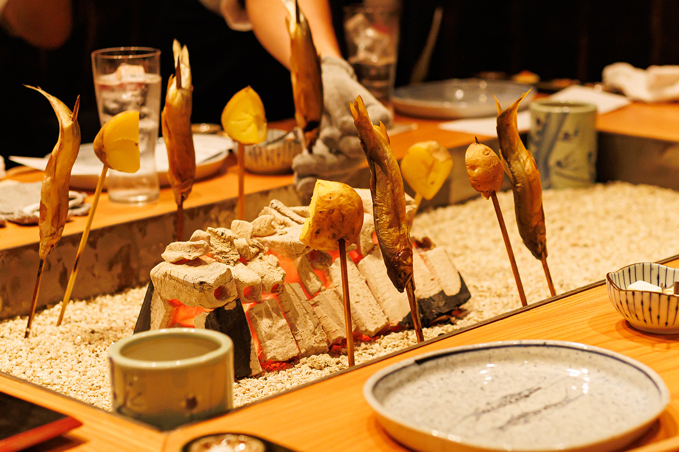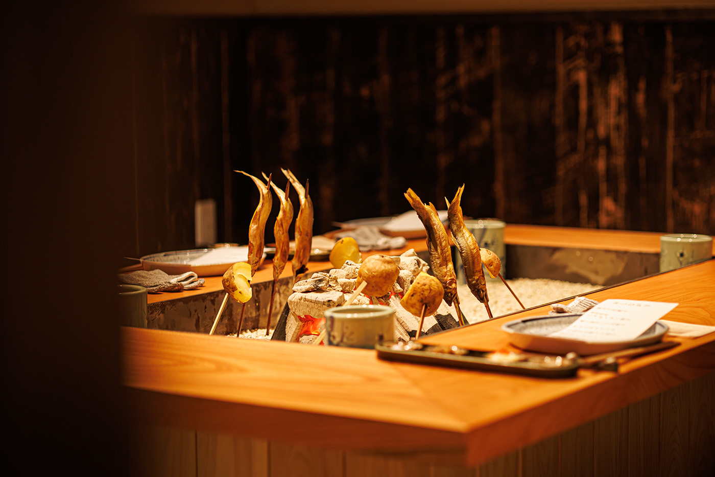 囲炉裏を囲み、普段の生活とは一線を引いた特別な空間で、鮎の塩焼きや黒毛牛のサーロインをご堪能いただけます。